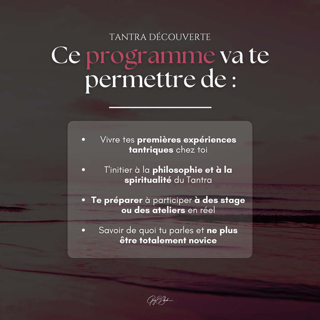 Grâce à ce programme, tu auras les bases du Tantra, tu découvriras les principaux concepts théoriques et philosophiques du Tantrisme et tu pourras vivre tes premières pratiques tantriques guidées.